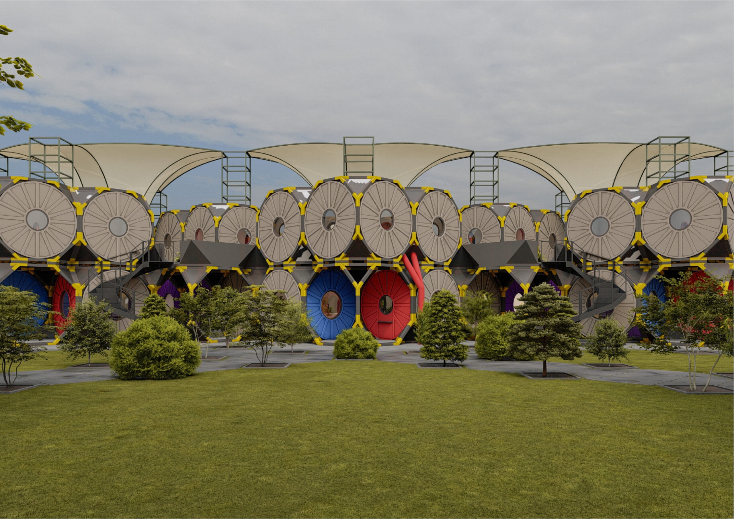 Abhar Cable Factory’s new prefabricated modular residence uses in-house cable reels and tensile cables as key architectural elements, creating functional, branded accommodation for managers and guests.