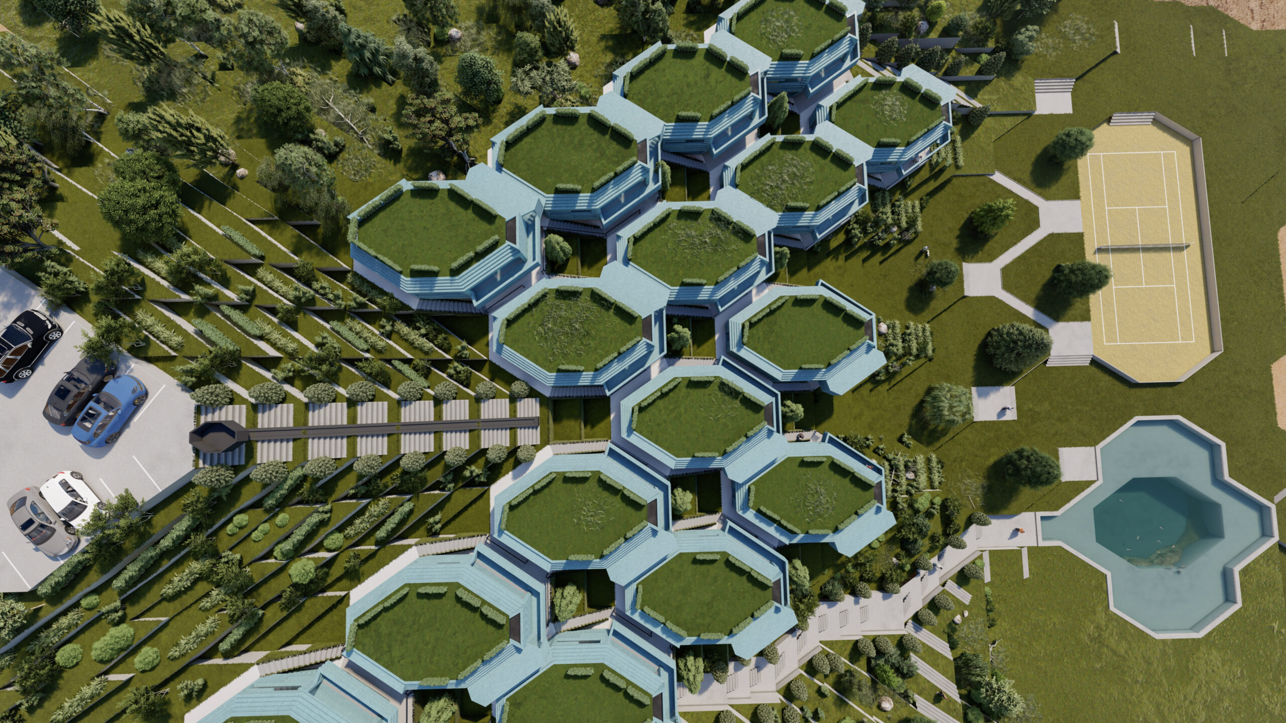 As overall geometry, each villa designed as an octagonal shape for better integration of units within the building typology and also creates shared roof terraces for individual villas and concentrating all facilities for efficient use.