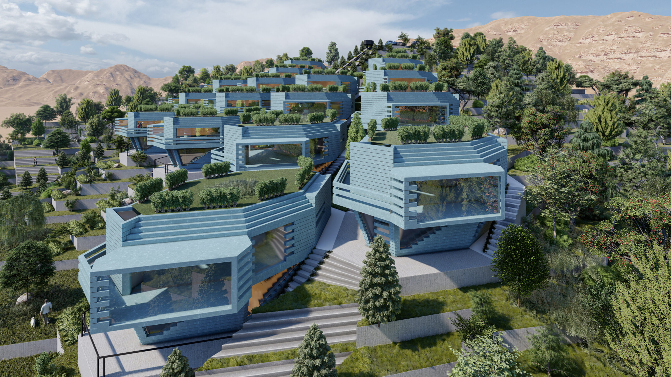 The project aimed to design 16 villas for 16 Iranian artists in ‘Zardareh’ close to Tehran the capital. The land area is about 15,000 sqm in which includes 8 types of plantations needs to preserved as well as using the river in down slope for site irrigation and water features. The brief also required to design all the villas as close to each other as possible in an extreme slope in order to maximize plantation and vegetation and minimum cost in excavation.